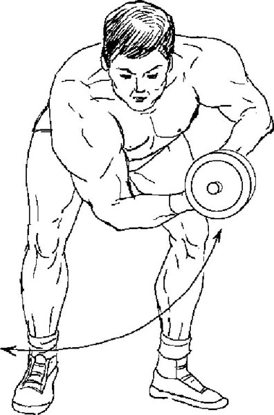 Описание движения. Удерживая плечевую часть левой руки неподвижной, опустите гантель назад и вниз по полуокружности в самую низкую позицию. Переместите ее по той же дуге в исходное положение.