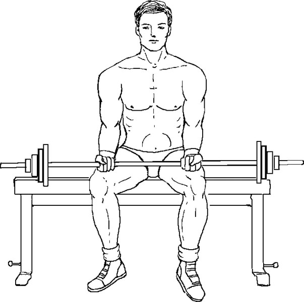 Исходное положение. Сидя на краю скамьи, держите гантели в обеих руках.