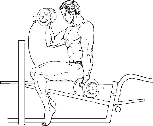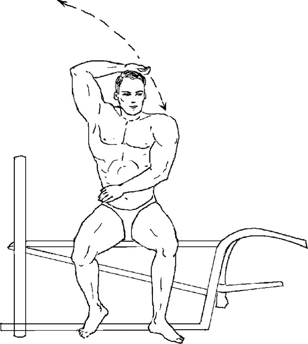 Исходное положение. Сидя на краю скамьи, в левой руке гантель, правая кисть на левой стороне таза; выпрямите левую руку вверх от плеча; ладонь при этом направлена вперед.