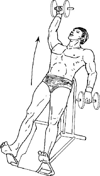 9. Жим на наклонной скамье (гантели). «Нижнее положение – гантели параллельны полу». Прямой аналог этого упражнения – упражнение 6 из комплекса № 3 Вейдера, жим штанги на наклонной скамье.