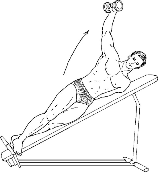 6. Разведение рук через стороны на наклонной скамье. Описание у Ривза: «Ложитесь на наклонную скамью на бок и начинаете подъемы одной рукой, с задержкой в верхней точке. После выполнения необходимого количества повторений на одну руку перейдите к тренировке второй руки».