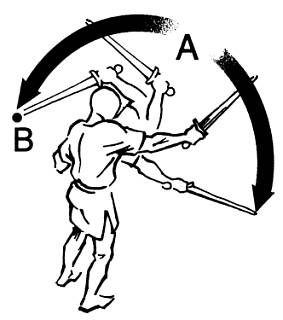 В формировании скоростного показателя играет роль еще один момент. Выход руки из удара на замах должен проходить как можно ближе к себе. Это позволяет избегать мертвой точки (В) и долгой траектории меча (А), когда оружие отводится назад по большой и размашистой дуге.