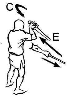 Если описывать процесс так же схематично, то он выглядит как рывок (Е) оружия на себя с последующим его разворотом в момент начала следующего удара (С).