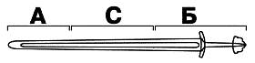 На схеме обозначены: (А) — зона максимальной силы удара, (Б) — зона минимальной силы, (С) — зона, поражающие свойства которой во многом зависят от центра тяжести оружия и стадии удара (положения оружия в плоскости удара).