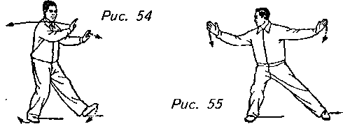 Движение 1 (продолжает рис. 53): Перенесите вес своего тела назад на правую ногу и поверните весь корпус вправо. Выполняя поворот тела, выверните носок левой ноги внутрь, а носок правой ноги — наружу и перейдите на правый "шаг вдоль кромки радуги”. Одновременно с этим разведите руки в стороны, следя за тем, чтобы локти расслабленно опадали, а ладони были направлены под углом вниз. Взгляд при этом обращен на правую руку (рис. 54, 55).