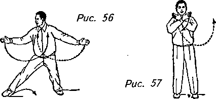 Движение 2: Медленно перенесите тяжесть своего тела на левую ногу, выверните носок правой ноги внутрь и отводите правую ногу назад так, чтобы расстояние между стопами было приблизительно равно ширине плеч, затем медленно выпрямляйте ноги, направляя носки вперед. Одновременно с этим обе руки опускайте к низу живота по дугообразной траектории, потом переведите их движением внутрь и вверх до перекрещивания их перед грудью, при этом ладони должны быть направлены к груди, правая — снаружи, а взгляд обращен прямо вперед (рис. 56, 57).