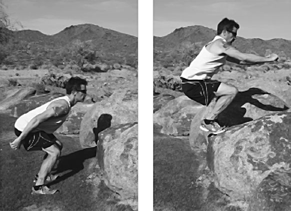 2. Немного присядьте и наклонитесь вперед в пояснице (положение аналогично половинному приседу). Махом отведите руки назад, перенесите вес тела на носки и выпрыгните вверх, чтобы с места запрыгнуть на ящик.