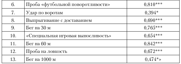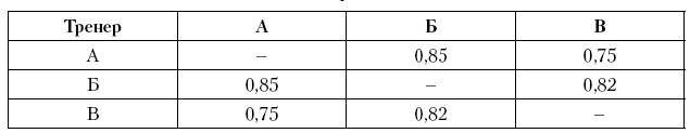 Три тренера, работающие ежедневно с этими футболистами, оценивали их независимым способом по шкале от 1 до 32 баллов. Согласованность оценок (измеряемая коэффициентами корреляции) была высокой и колебалась от r = 0,75 до r = 0,85 (табл. 36).