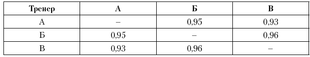 Помимо статистической достоверности всех коэффициентов корреляции на уровне Р<0,001, эти результаты были признаны неудовлетворительными. С целью повышения согласованности экспертных оценок использовался протокол наблюдений, относительно которого педагоги повторно оценивали спортсменов, особое внимание уделяя тем из них, уровень спортивного мастерства которых был примерно одинаков.