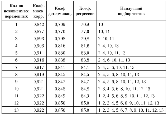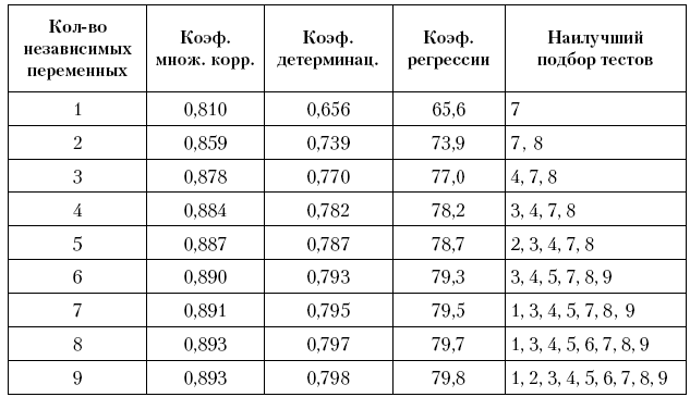 Выбор наилучшего варианта регрессии составили 4 теста, общая информативность которых достигла 78,2 % (табл. 40).