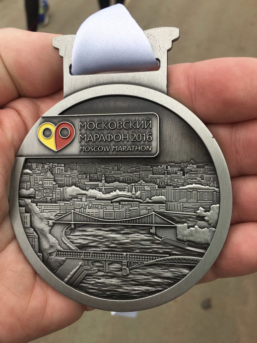 И – вот она, награда, которая ждала меня на финише: моя первая марафонская медаль финишера, настоящая и очень увесистая. Я сделал это!