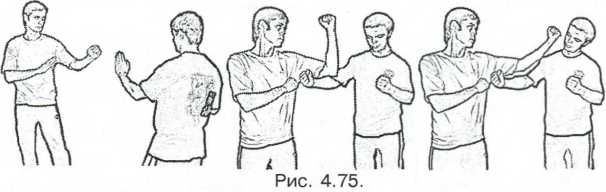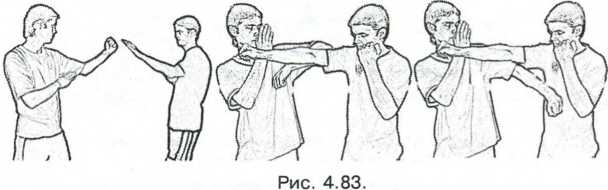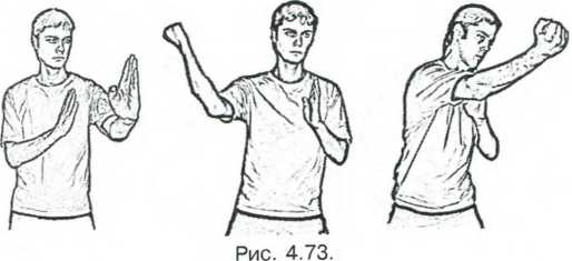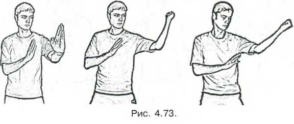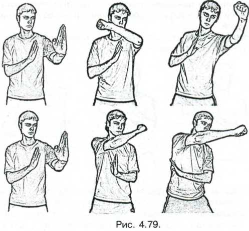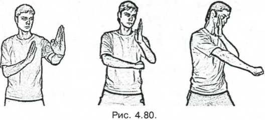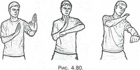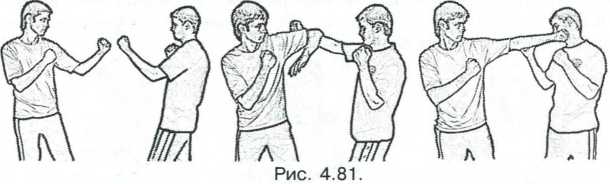 На рис. 4.81 противник наносит удар правой рукой. Боец блокирует удар локтем с внутренней стороны. Сразу после блока, за счет разгибания локтя, наносится обратный удар молотом.