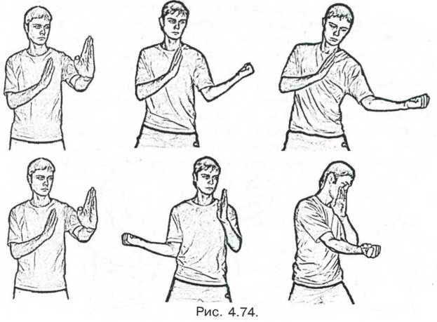 На рис. 4.75 противник наносит прямой удар правой рукой. Боец блокирует этот удар локтем сверху вниз. Сразу после блока наносится удар основанием кулака. Удар является продолжением блока и осуществляется слитно, словно одно движение без лишних пауз.