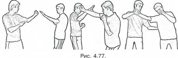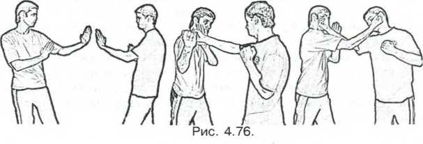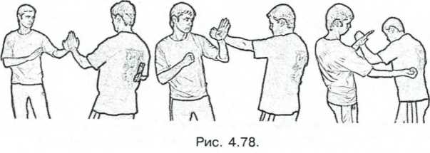 На рис. 4.76 противник наносит прямой удар правой рукой. Боец блокирует этот удар ладонью левой руки. Одновременно заносит правую руку для нанесения верхнего удара молота. Сразу после блока боец наносит удар.