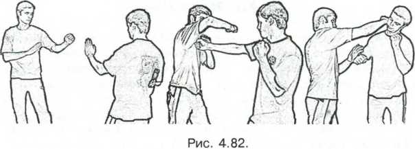 На рис. 4.82 противник наносит удар правой рукой. Боец блокирует удар ладонью левой руки с внешней стороны. Одновременно правая рука заносится на удар. Сразу после блока и контроля ударной руки противника боец наносит верхний удар молот правой рукой.