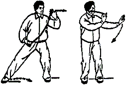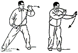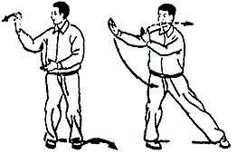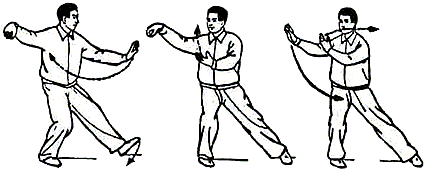 Обратить внимание: для поворота корпуса в качестве оси использовать позвоночник. Талия и бедра расслаблены. Не делать резких движений по вертикали. Движения рук – естественные, округлые и следуют за движениями талии. Темп медленный и ровный. При движении нижних конечностей добиться хорошей балансировки. Следить взглядом за кистью, двигающейся перед лицом. В конечном положении направление на 10–11 часов.