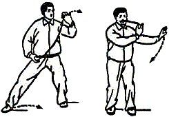 1. Перенести вес тела на правую ногу. Медленно поворачиваясь направо в направлении 1—2 часов, повернуть левую стопу вовнутрь. При этом сделать левой кистью движение по дуге мимо живота к правому плечу. Ладонь у живота поворачивается вверх. При подходе левой кисти к правому плечу правая кисть открывается ладонью наружу. Смотреть на левую кисть (рис.87–89).