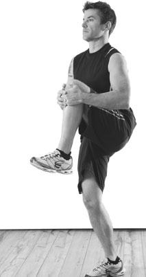 1. Станьте прямо, затем одним движением согните левую ногу в колене и поднесите колено к груди.