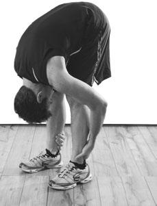 3. Сделайте шаг вперед правой ногой и выпрямитесь. Наклонитесь в пояснице и опустите голову к коленям; держите спину прямой, руками обхватите голени с тыльной стороны. С помощью рук осторожно притяните голову немного ближе к коленям.