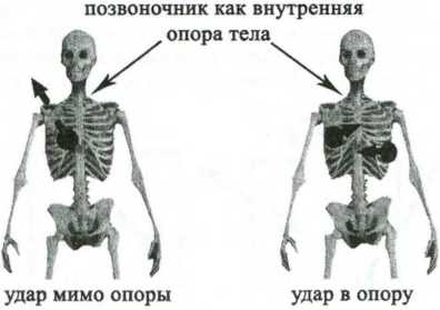 Наоборот, если удар направлен в позвоночник, в опору, в структуру, костяк противника, то сила удара по степени воздействия будет максимальной, т.к. в этом случае телу некуда уходить и вращаться. Удар встречает жесткость опоры, ему есть куда передать ударный импульс в более полной мере.