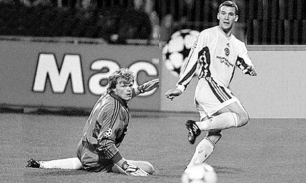 Длинная передача Каладзе на выход форварду была отрепетирована еще в первом матче с «Лансом» — только там бил Ребров, Вармюз выручил. Здесь же центральный защитник «Ланса» Дею толкнул Шевченко в спину, и словак Любош Михел тут же достал красную карточку. С этого момента победа киевлян стала делом техники, но та долго время подводила гостей — моменты пороли отчаянно. Шевченко в итоге забьет только с четвертого выхода своего один на один; в первом тайме он, перебросив Вармюза, угодит в стойку. Только на исходе часа игры Каха Каладзе завершит фирменную динамовскую комбинацию: подача Косовского с углового, Ребров на ближнем углу вратарской перебрасывает мяч на дальнюю стойку, и грузинский наш легионер, впоследствии министр энергетики своей страны и мэр ее столицы, головой буквально внес мяч в сетку. Как сейчас помню — смотрел на реакцию Михела, и как-то он задержался у ворот… «Неужто не засчитали?» — подумалось, и некоторое время ваш автор провел в непонятках.