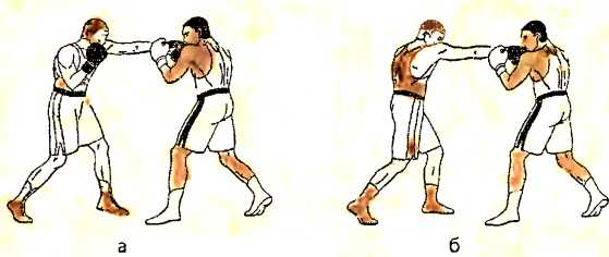 б) отталкиваемся правой ногой и, с шагом вперед, наносим ответный прямой удар левой рукой в туловище противника;