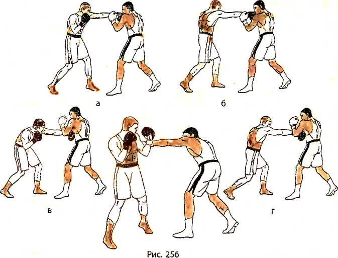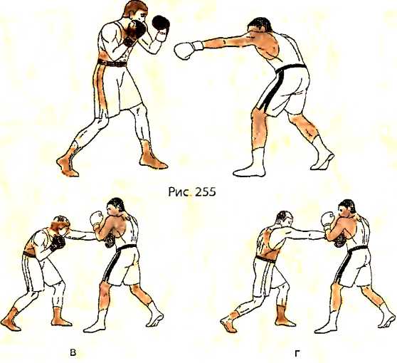 в ) отталкиваемся правой ногой и, одновременно с шагом левой ногой вперед, наносим ответный прямой удар левой рукой в туловище противника;