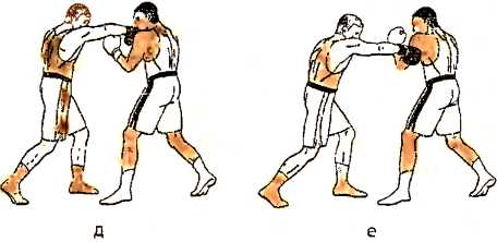 д ) роняем левый кулак вниз, а затем, отталкиваясь левой ногой, наносим ответный удар снизу левой рукой в туловище противника одновременно с постановкой правой ноги в удобное положение.