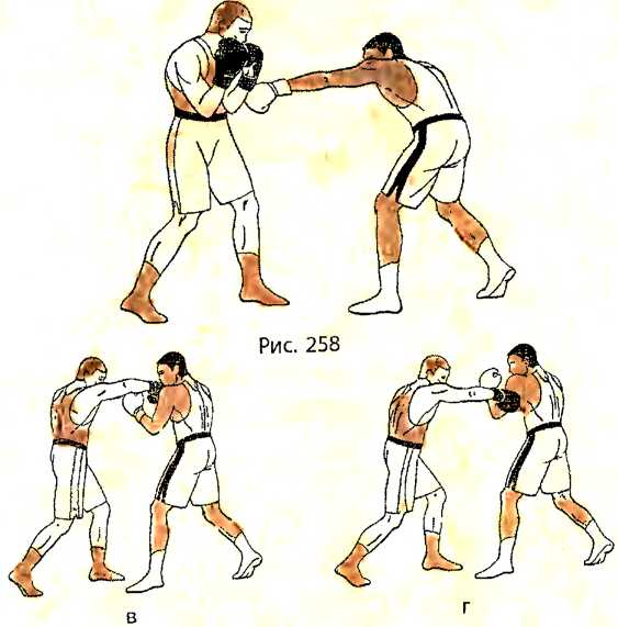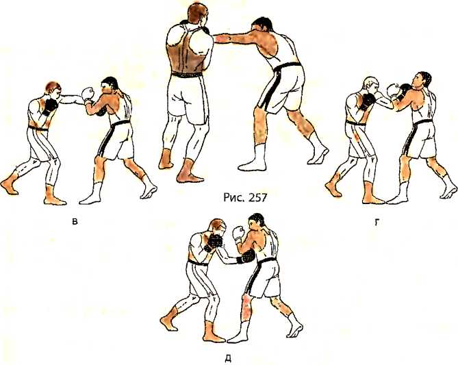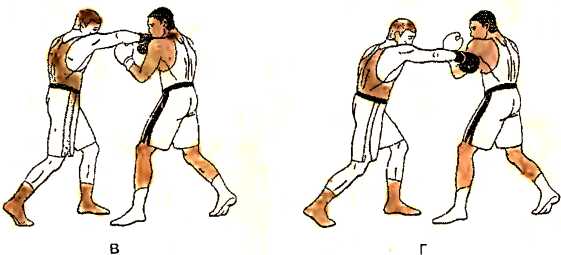 г ) роняем левый кулак немного вниз, а затем, отталкиваясь левой ногой, наносим ответный удар снизу левой рукой в голову противника одновременно с постановкой правой ноги в удобное положение;