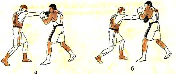 б ) отталкиваемся правой ногой и наносим ответный прямой удар правой рукой в туловище противника;