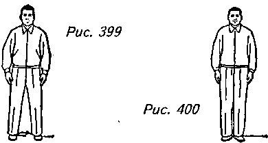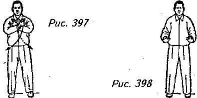 Движение (продолжает рис. 396): Поверните обе ладони от себя, разведите их в стороны и медленно опустите вдоль внешних поверхностей бедер, направив ладони вниз. Затем сведите ноги (обычно приближают левую ногу к правой), переходя таким образом к исходной позиции — сосредоточенному вниманию. Взгляд по-прежнему устремлен вперед (рис. 397—400).