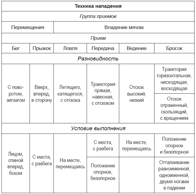 Участие в нападении обязывает гандболиста быть в постоянной готовности к перемещению по площадке, принятию мяча и его передачи партнеру. Для этого спортсмен применяет определенные приемы перемещения и владения мячом (табл. 4).