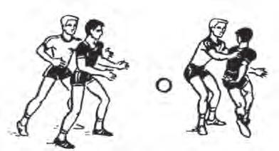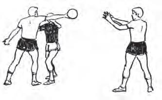 Опорные броски можно выполнить без наклона и с наклоном туловища, когда на пути полета мяча возникает защитник. Чем быстрее выполняется наклон, тем меньше вероятность ответной реакции защитника. Важно делать наклон в основной фазе броска, а до этого скрывать свои намерения. Последний шаг делать в сторону наклона, следить, чтобы рука не отставала от движения туловища (рис. 18).