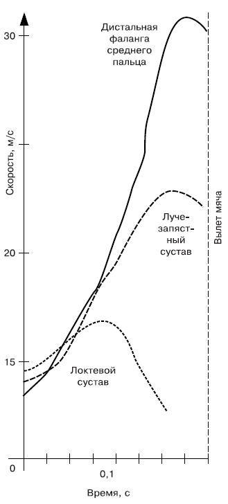 Каждое последующее звено начинает движение, когда скорость предыдущего достигает максимума. Нарастание скорости сегментов руки при броске показано на циклограмме (рис. 17).