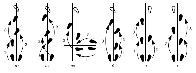 Рис. 14. Схема разбегов при броске правой рукой в опорном положении: а1, а2, а3 – со скрестным шагом, б – с подскоком, в – с приставным шагом, г – обычными шагами