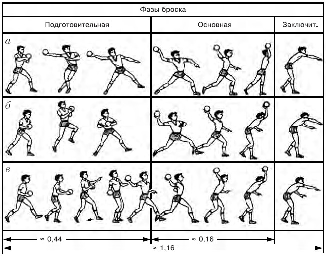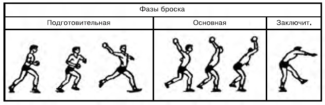 В основной фазе броска необходимо резко и последовательно тормозить движения ног, таза, туловища, локтя. Для осуществления этой задачи спортсмен из двухопорного положения постепенно переносит тяжесть тела на впереди стоящую ногу. Когда опорная нога, туловище и рука с мячом приблизятся к вертикали, он выпрямляет опорную ногу и наклоняет туловище вперед, завершая при этом разгон мяча и выпуская его.