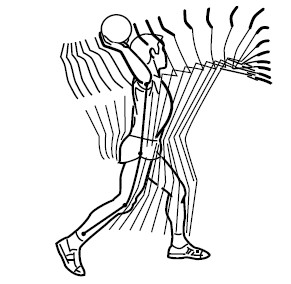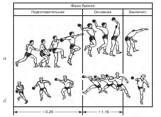 При опорном броске с разбега со стопорящим последним шагом в разбеге сообщается ускорение всей многозвенной системе гандболист – мяч. Количество движения, полученное в разбеге, – величина постоянная. По закону сохранения количества движения по мере уменьшения массы движущихся звеньев (ноги, туловища, плеча и др.) скорость их должна возрастать. За счет последовательного тормозящего действия правой, а затем левой ноги происходит торможение звеньев тела снизу вверх. Это приводит к уменьшению движущейся массы спортсмена и, как следствие, к увеличению скорости вышележащих звеньев, вплоть до кисти, пальцев и, наконец, мяча.
