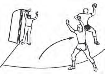 К высшему мастерству можно отнести бросок крайнего нападающего, когда он, оттолкнувшись, пролетает над площадкой вратаря к центру, увеличивает тем самым свободное пространство в воротах (вратарь сместится вместе с ним), куда и будет посылать мяч (рис. 21).
