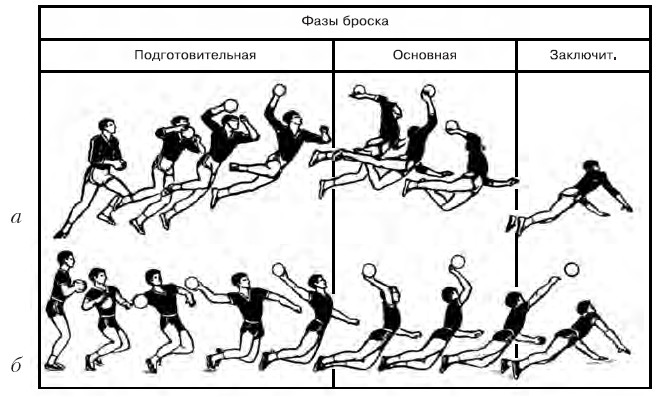 При выполнении броска в опорном положении гандболистам высокой квалификации свойственна активная постановка ног. Так, время принятия двухопорного положения составляет у мастеров 221 мс, а у игроков низкой квалификации – 353 мс.