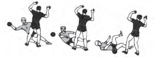 3. Штрафной бросок выполняют в падении с опорой на одну ногу и выполнением отмаха другой ногой. Кроме того, можно произвести бросок в падении с двух ног (см. рис. 22, б).