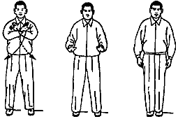Повернуть ладони наружу и медленно опустить руки по сторонам тела, сделав глубокий вдох (выдох удлиннен). При опускании рук тело должно быть расслаблено. Смотреть перед собой. Восстановив дыхание, поставить левую стопу к правой. Затем немного походить (рис. 172–174).