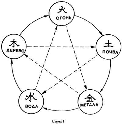 «Пять элементов» — «дерево», «огонь», «почва», «металл» и «вода» суть пять видов изменения движения материи, которые производят все многообразие предметов и явлений в космосе. Связи между «пятью элементами», природой и человеческим организмом показаны в приведенной таблице.