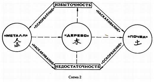 Под «наскакиванием» имеется в виду «использование слабости для проникновения»: например, при «недостаточности преодолеваемого элемента» создается «избыточность преодолевающего». В свою очередь «оскорбление» подразумевает «опору на силу и угнетение слабости»; иначе говоря, если «преодолеваемый элемент» характеризуется «избыточностью», то он оказывается по отношению к «преодолевающему элементу» в роли «хозяина» (то есть доминирующего начала), который «оскорбляет гостя», то есть сам «преодолевает» его. Связи «наскакивания» и «оскорбления» показаны на схеме 2 на примере взаимоотношений «элементов» «металл», «дерево» и «почва».
