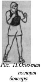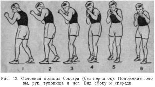 случае необходимости защищаться от атакующего противника. Поэтому боевая позиция должна быть удобной для самых разнообразных действий и во всяком случае служить удобным исходным положением для основных передвижений, ударов и защит. Правда, у боксера может быть очень большое количество исходных положений, кроме основной стойки, так как в бою ему приходится совершать самые различные движения, нападая на противника или защищаясь от него.
