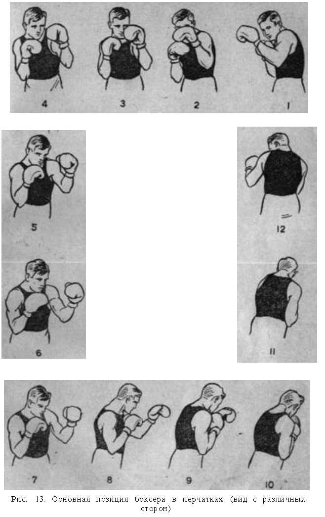 и направлены на противника (мизинцем левой ноги как бы указывая на него). Вес тела равномерно распределен на обе ноги. Туловище повернуто вперед левым плечом, которое (плечевой сустав) приподнято несколько выше правого. Живот слегка втянут, а таз — немного подан вперед. Отклонять туловище вправо и влево не следует. Голова слегка наклонена и опущена подбородком на грудь. Левая рука плечом (до локтя) прикрывает туловище. Кулак ее полусжат и направлен на голову противника. Локоть отходит от туловища не больше 10–12 см. Локтем правой руки боксер закрывает правую сторон) туловища; кулак полусжат и находится у подбородка, (большой палец у середины подбородка); кулак также направлен в сторону противника. Защищая лицо, боксер должен быть в то же время готовым нанести удар правой рукой (рис. 12, 13).