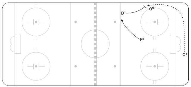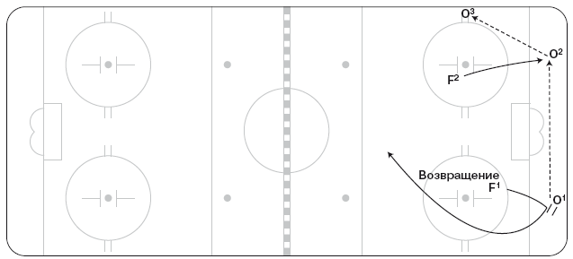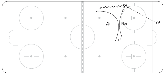У находящегося вдали от ворот F3 появляется два варианта действий, которые повлекут за собой выход из зоны. Во-первых, можно немедленно попытаться отобрать шайбу во время паса, если есть поддержка от товарища по команде, который возвращается на дальнюю от себя точку вбрасывания. Если такой подстраховки нет, то второй вариант заключается в плавной блокировке. Здесь подразумевается, что F3 не вступает в силовое противодействие, а выходит под углом к противостоящему игроку в направлении центра (к собственным воротам) и лишает его свободного пространства или заставляет поспешить с пасом (рисунок 7.11). Таким образом, он продолжает участвовать в атаке, не оставаясь позади. Если противостоящему игроку удается сделать удачный пас к центру, позиция F3 все же выгодна для осуществления бэкчекинга и преследования в ходе стремительной атаки.