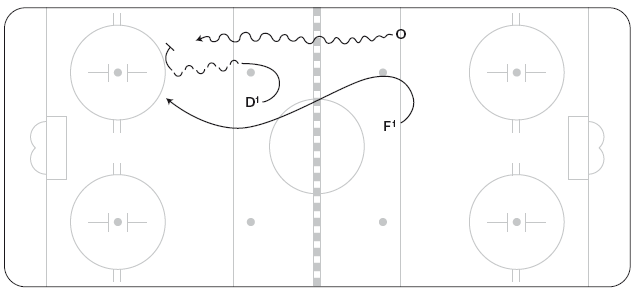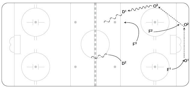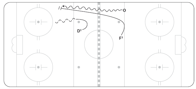 Рисунок 7.14. D1 встречает владеющего шайбой игрока у линии, а F1 закрывает центр площадки.