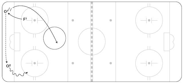 2. F1 жестко прессингует владеющего шайбой игрока сзади и не оставляет попытки отбора шайбы. На пути к зоне он позволяет владеющему шайбой игроку перемещаться по ширине площадки. D1 понимает, что это часть стратегии, и занимает позицию внутри зоны. Поджидая игроков, перемещающихся последними, он страхует F1 (рисунок 7.15).