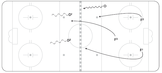? Установите правила для F1 и D1. Обязательно определите правила относительно того, кто действует против владеющего шайбой игрока, когда действия приближаются к вашей синей линии, а кто займет позицию внутри зоны. Есть два способа осуществить это.