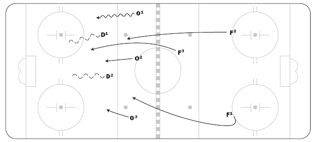 Необходимо, чтобы игроки в зоне нападения осознавали возможность потери шайбы и быстро занимали соответствующие позиции для бэкчекинга.